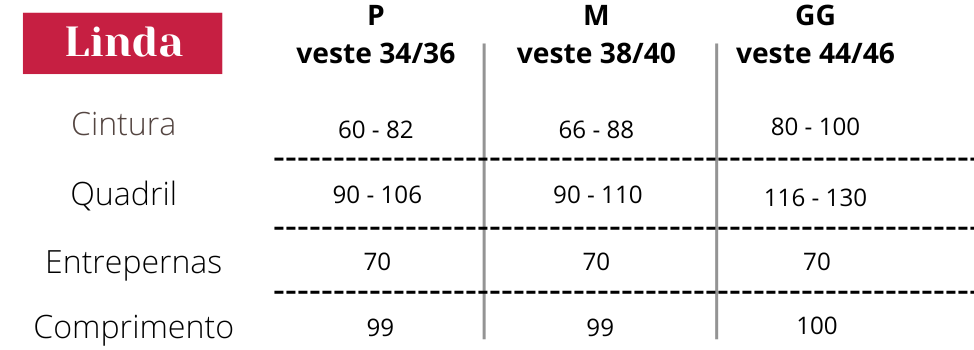 A Linda tem um tecido sofisticado de alta compressão e extretamente macio, que não marca o corpo. A cintura alta e o cós largo ajudam a modelar, garantindo um visual elegante e confortável.